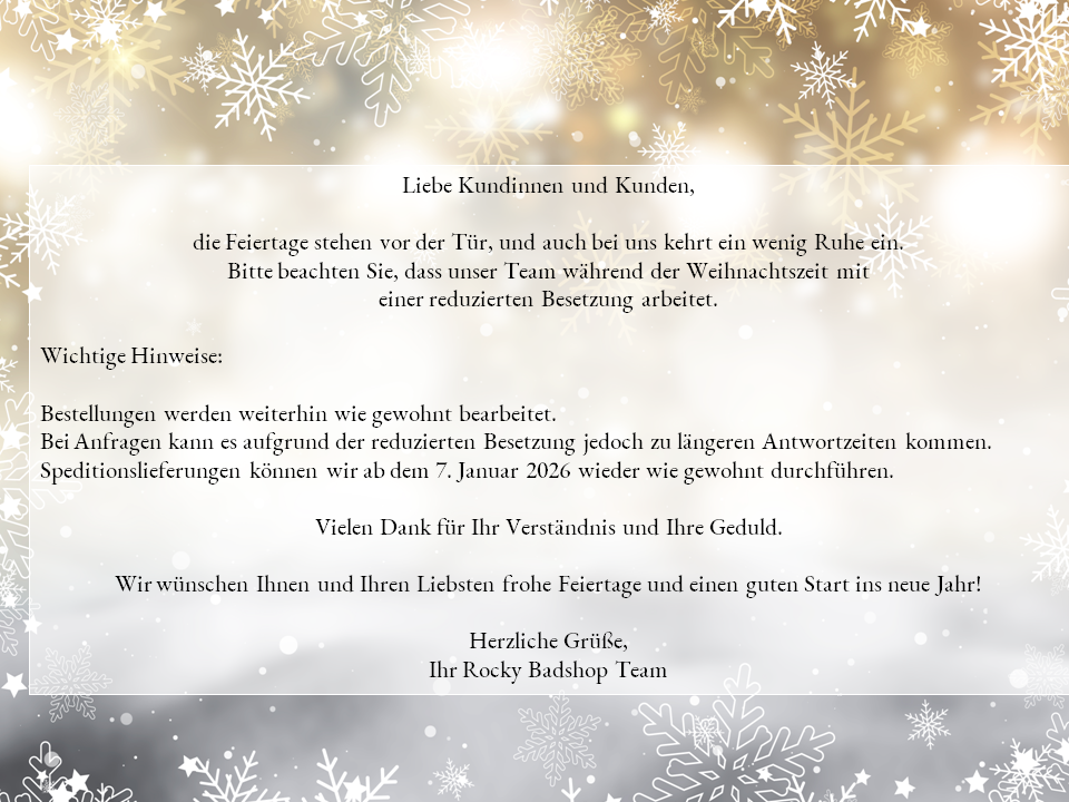 Ob Sie ein kleines Gäste-WC, ein großzügiges Familienbad oder eine lang ersehnte Wellnessoase bauen – unser Onlineshop ist Ihre ideale Anlaufstelle. Im Rocky Badshop erwartet Sie eine große Auswahl hochwertiger Badausstattung in vielen diversen Stilen, passend zu jedem Wunsch und Bedarf.
