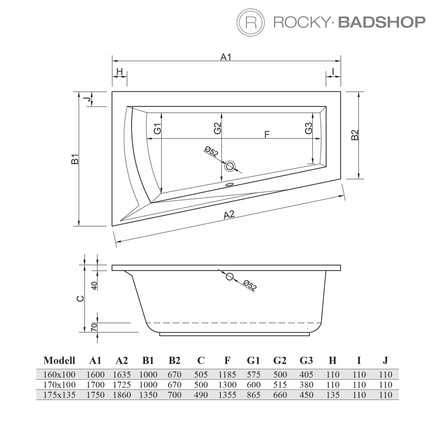 Acryl-Badewanne Lara 170 x 100/67 x 50cm weiss links Bodenlänge 130cm, 285 Liter (L17010050L)
