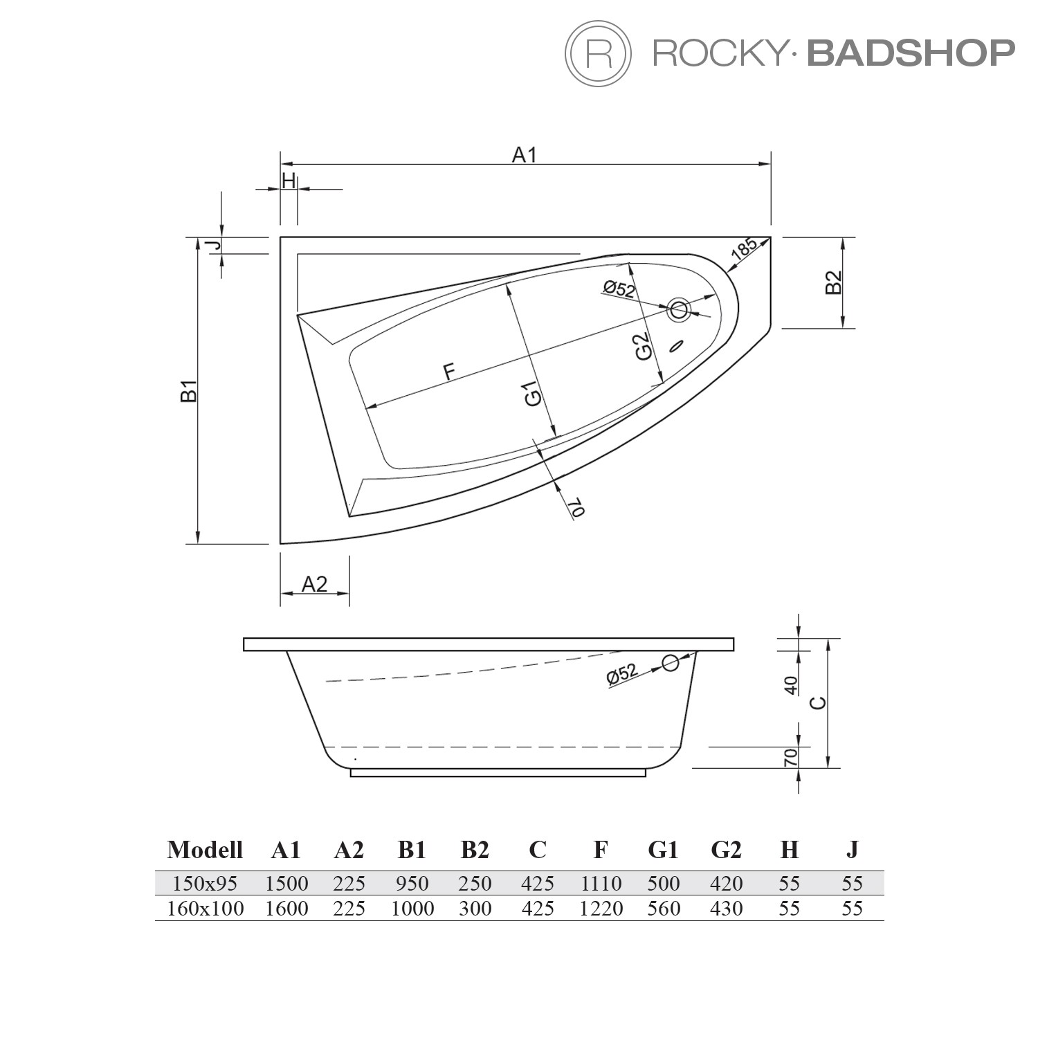 Acryl-Badewanne Silver 150 x 95 x 42,5cm weiss rechts Bodenlänge 111cm, 180 Liter