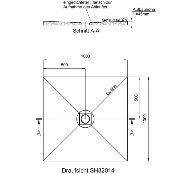 Bodenbündige, verfliesbare Duschtasse 1000x1000x45 mm (rollstuhlbefahrbar) Ablaufposition mittig, waagerecht / senkrecht (32014)