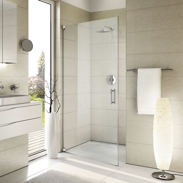 Minimalistische Beschläge sind das Kennzeichen für erlesene Duschen wie Achat R Plus. Die Hebe-Senk-Pendelbeschläge aus Vollmessing sind innen flächenbündig ins Glas eingelassen. Für bequemen, sicheren Einstieg auch in engen Bädern öffnen sich die Türen weit nach außen.
